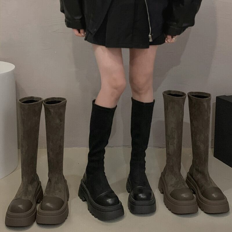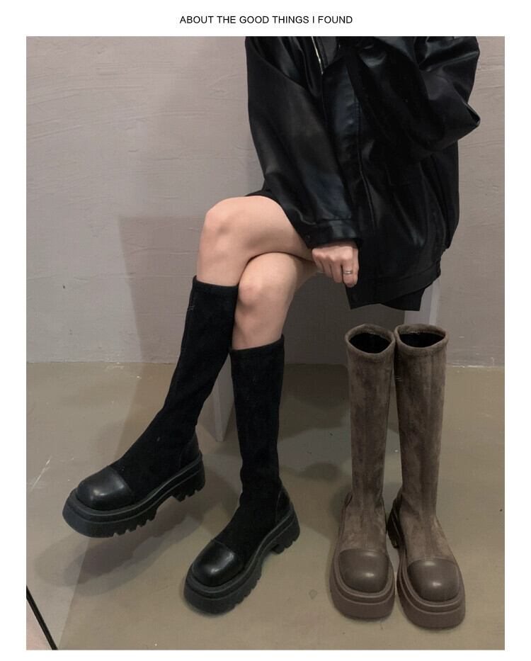 Jia Bujia 厚底ブーツ 2024 新秋レトロスタイルフレンチオールマッチ痩身弾性スリムブーツ 靴 シューズ エラスティック 伸縮 オータム 秋物 jxjxf22473680223