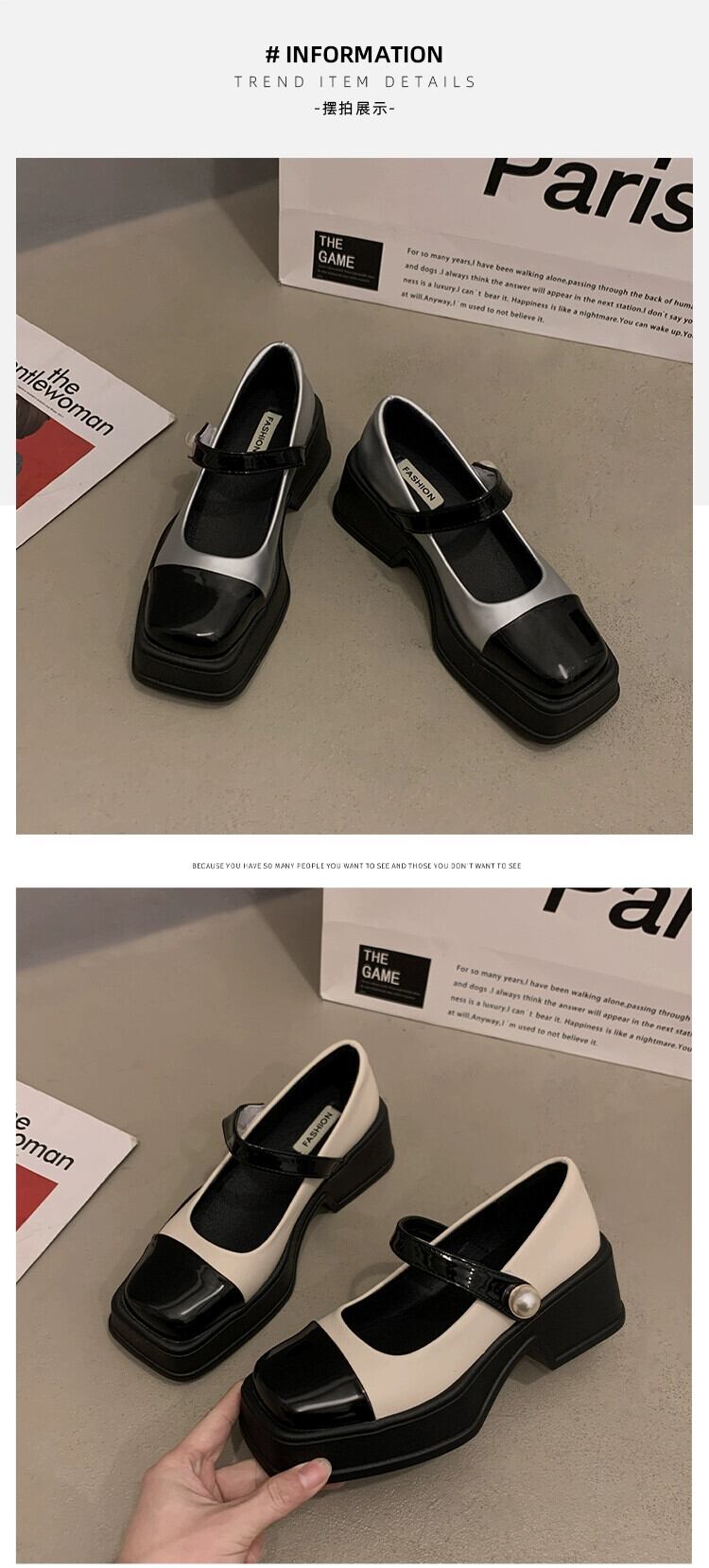 Jia Bufake メリージェーンの靴の女性の 2024 春フレンチスタイル可能なレトロスクエアトゥ太いヒールの小さな革の靴 シューズ スプリング 春物 レザー スクウェア jxjxf75258396197