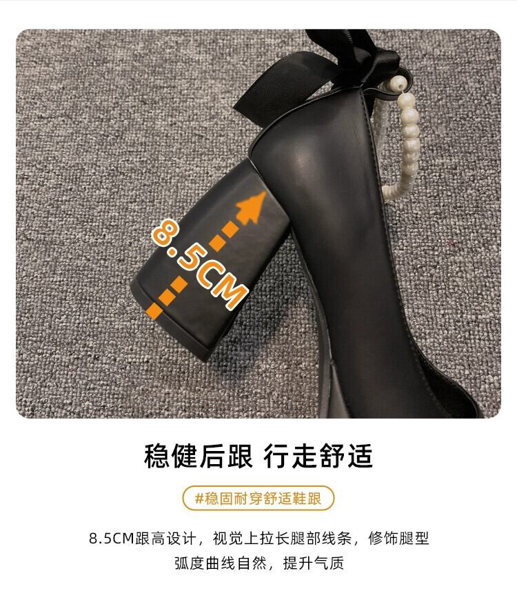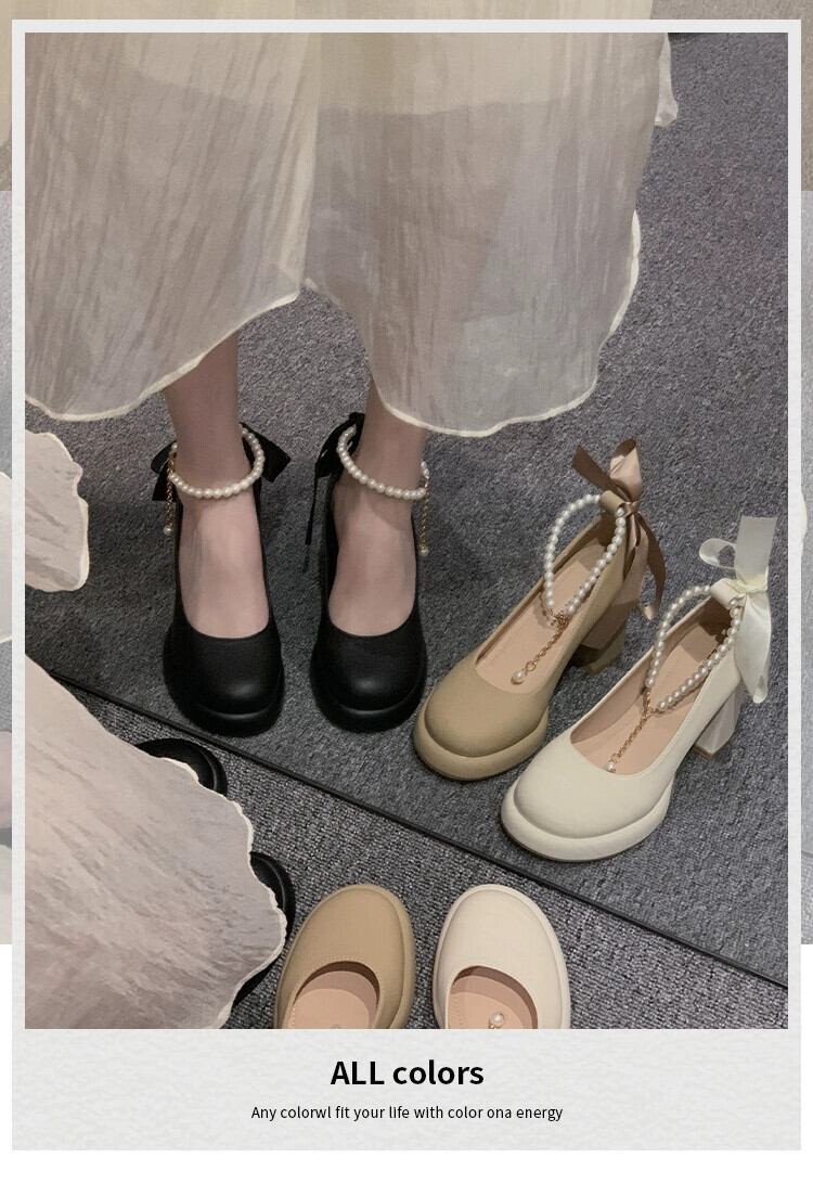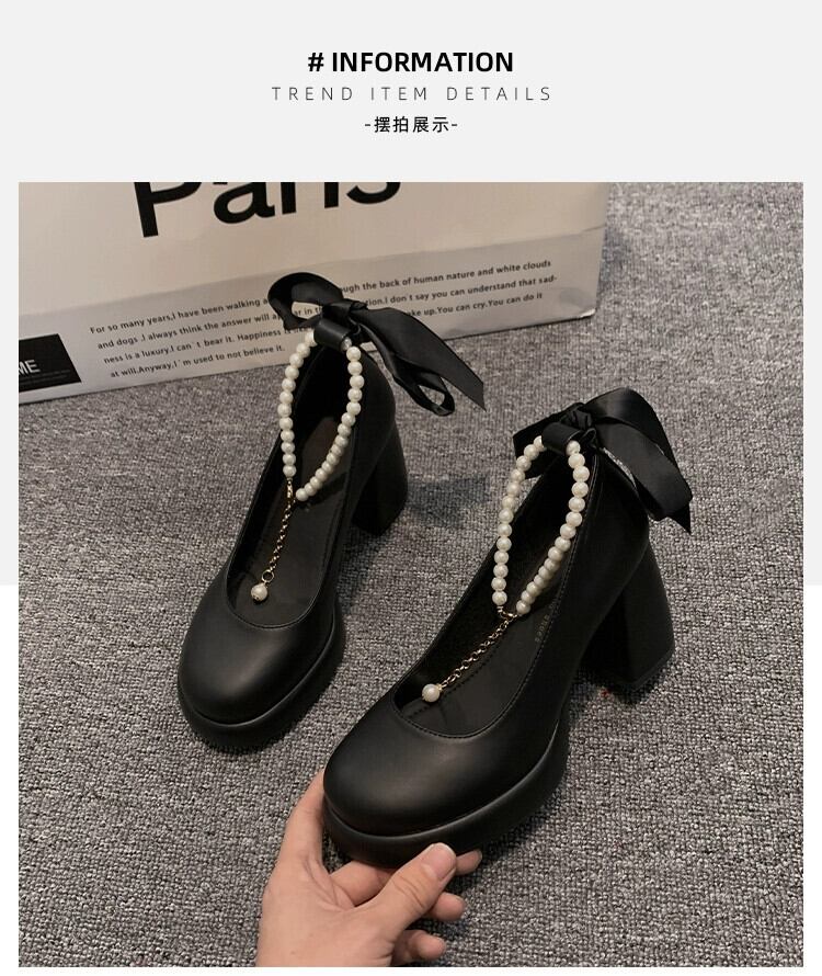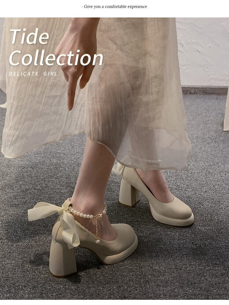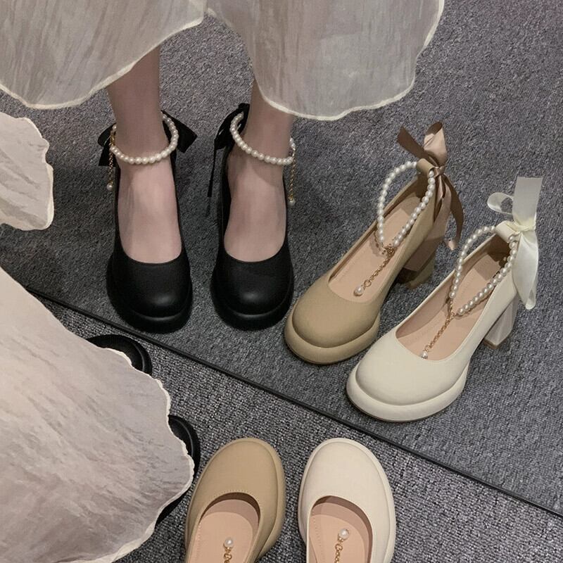 Jia Bujia インターネット有名人のハイヒールの靴の女性 2024 春の新しい気質優しい妖精スタイルのパールリボンメリージェーンの靴 シューズ スプリング 春物 真珠 jxjxf40195342498