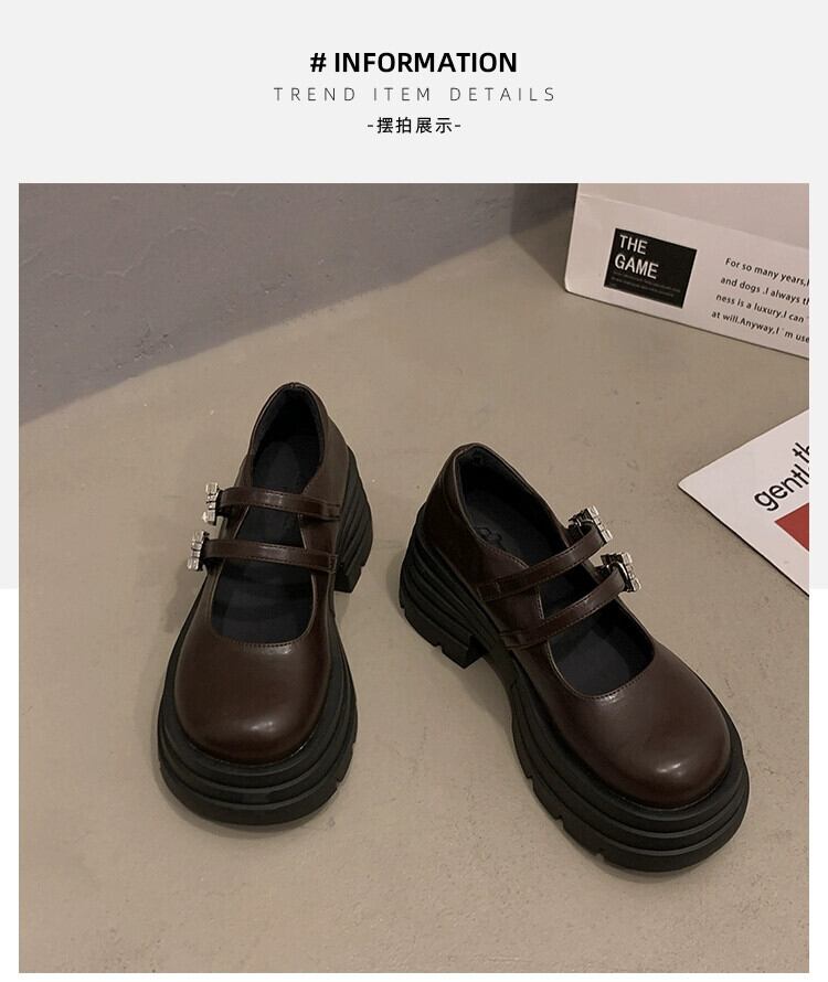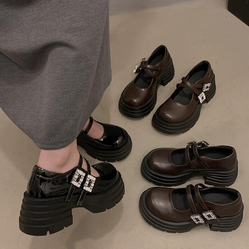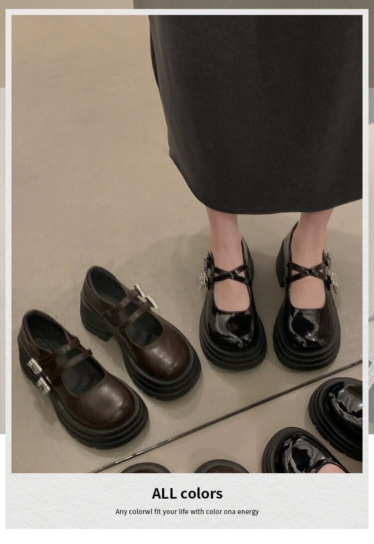 Jia Bujia スタイルシングルシューズ女性 2024 春の新スタイルレトロラインストーンファッション気質厚底メリージェーン革靴 スプリング 春物 レザー jxjxf32525050607